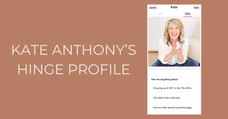 So many of you have reached out to say you loved hearing Kate Anthony’s story on the second episode of The Dating Lab — I’m so touched!! Kate and I talk a lot about her Hinge profile on the episode, so as a bonus, I’m giving you a look at her A+ profile here. What … Continue reading Kate Anthony’s Hinge Profile